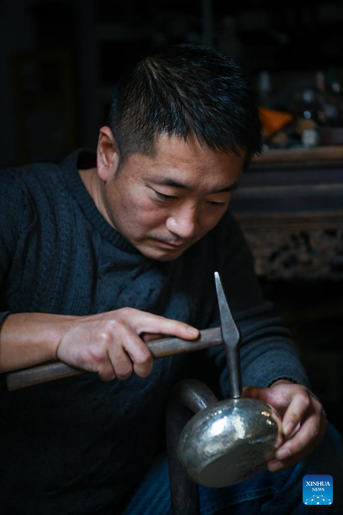 Artisan Chen Rongge makes a silver pot at his studio in Shangwei Village, a Hakka village with a history of more than 400 years, in Longhua District of Shenzhen, south China's Guangdong Province, on Dec. 13, 2024. Since 2017, the local government has introduced nearly 100 artistic talents to Shangwei Village to revitalize the ancient village with arts on the basis of originality and cultural creativity.