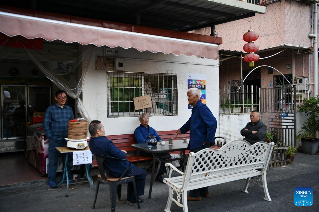 Senior residents have a chat at the entrance of a grocery in Shangwei Village, a Hakka village with a history of more than 400 years, in Longhua District of Shenzhen, south China's Guangdong Province, on Dec. 13, 2024. Since 2017, the local government has introduced nearly 100 artistic talents to Shangwei Village to revitalize the ancient village with arts on the basis of originality and cultural creativity.
