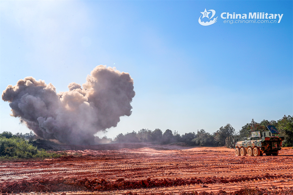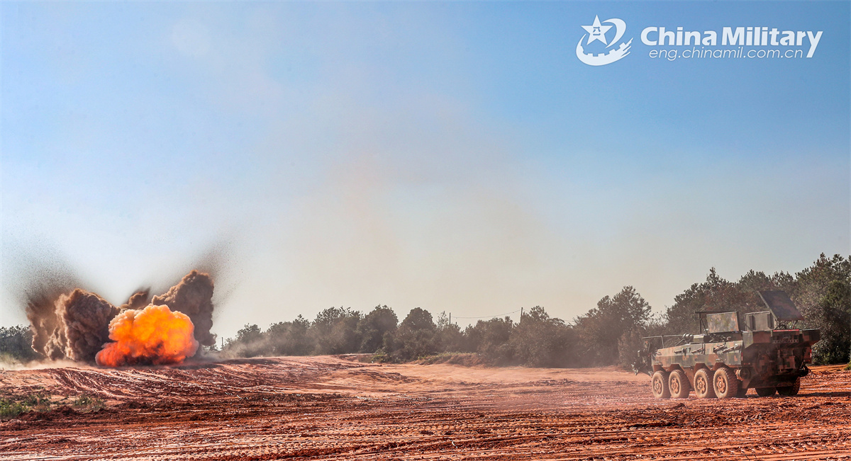 An integrated minesweeping vehicle attached to an engineer element of a brigade under the Chinese PLA 72nd Group Army detonates explosives in the obstacle area during a minesweeping operation on November 26, 2024. (eng.chinamil.com.cn/Photo by Zhang Mao)