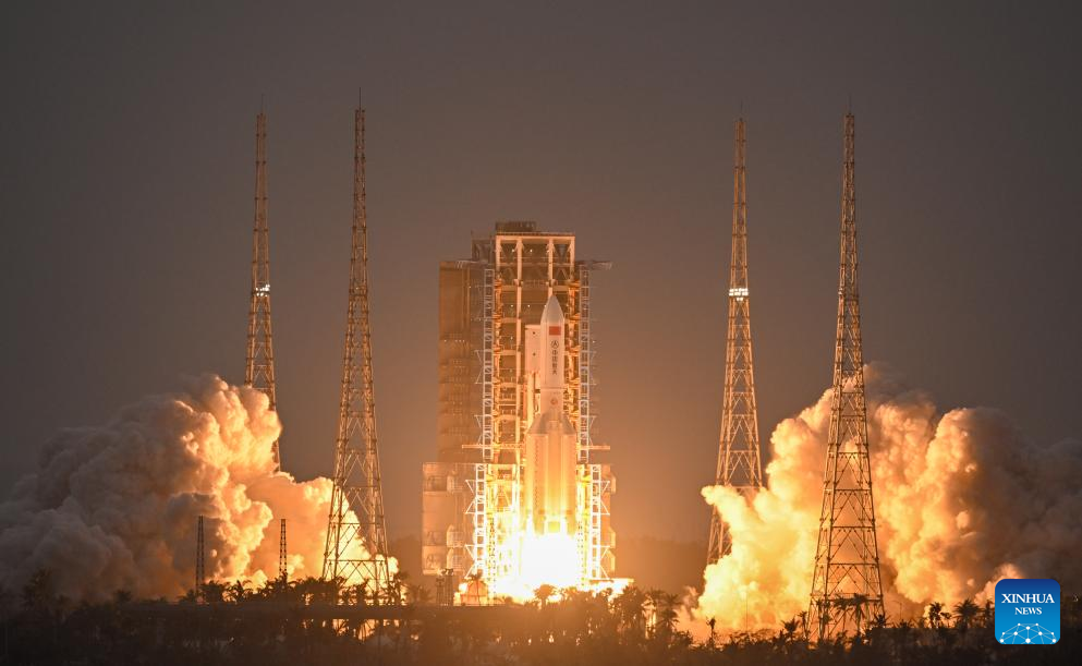 A group of low Earth orbit satellites is launched by a Long March-5B carrier rocket with a Yuanzheng-2 (Expedition-2) upper stage atop the rocket from the Wenchang Space Launch Site in south China's Hainan Province, Dec. 16, 2024. China successfully sent the first group of low Earth orbit satellites for a satellite internet constellation on Monday. At 6:00 p.m. (Beijing Time), this group of satellites was launched and the satellites have entered the preset orbits. (Photo by Du Xinxin/Xinhua)