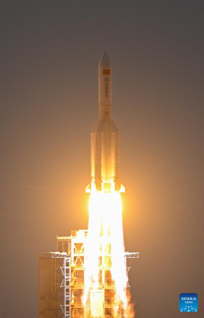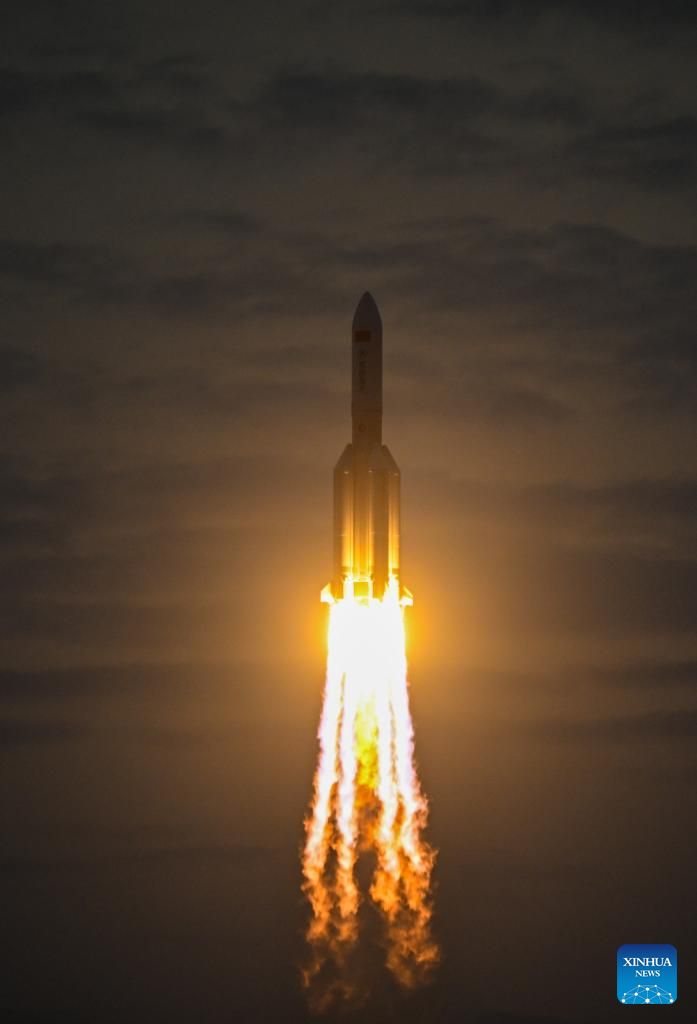 A group of low Earth orbit satellites is launched by a Long March-5B carrier rocket with a Yuanzheng-2 (Expedition-2) upper stage atop the rocket from the Wenchang Space Launch Site in south China's Hainan Province, Dec. 16, 2024. China successfully sent the first group of low Earth orbit satellites for a satellite internet constellation on Monday. At 6:00 p.m. (Beijing Time), this group of satellites was launched and the satellites have entered the preset orbits. (Xinhua/Yang Guanyu)