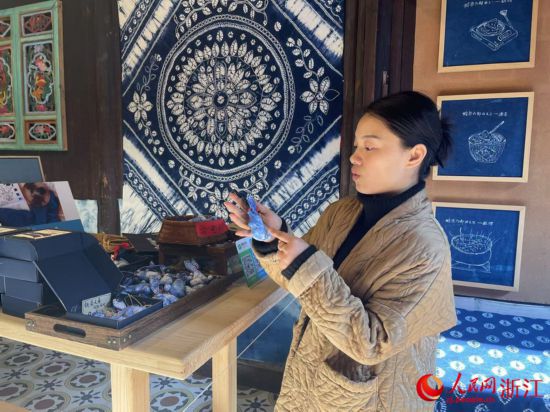 An artisan displays tie-dyed products in her shop in Lizu village of Yiwu city, east China's Zhejiang Province. (People's Daily Online/Wang Liwei)