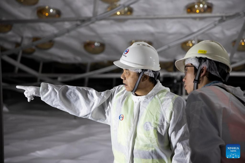 Ma Xiaoyan, chief engineer of the Jiangmen Underground Neutrino Observatory (JUNO), inspects the construction site of JUNO in Jiangmen, south China's Guangdong Province, Dec. 17, 2024. The liquid filling of the central detector of JUNO started on Wednesday. As one of the world's most powerful experiments to uncover neutrino mystery, JUNO is expected to operate for at least 30 years. (Xinhua/Jin Liwang)