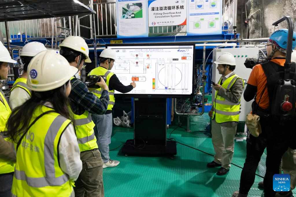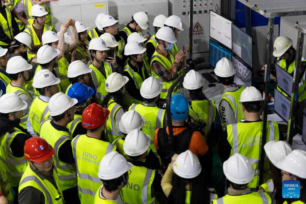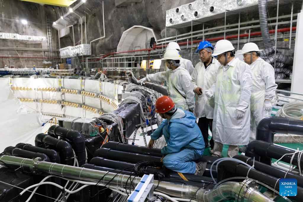 Researchers observe the status of the water tank after the liquid filling process started at the Jiangmen Underground Neutrino Observatory (JUNO) in Jiangmen, south China's Guangdong Province, Dec. 18, 2024. The liquid filling of the central detector of JUNO started on Wednesday. As one of the world's most powerful experiments to uncover neutrino mystery, JUNO is expected to operate for at least 30 years. (Xinhua/Jin Liwang)