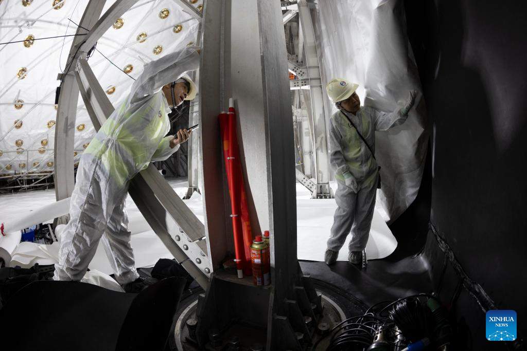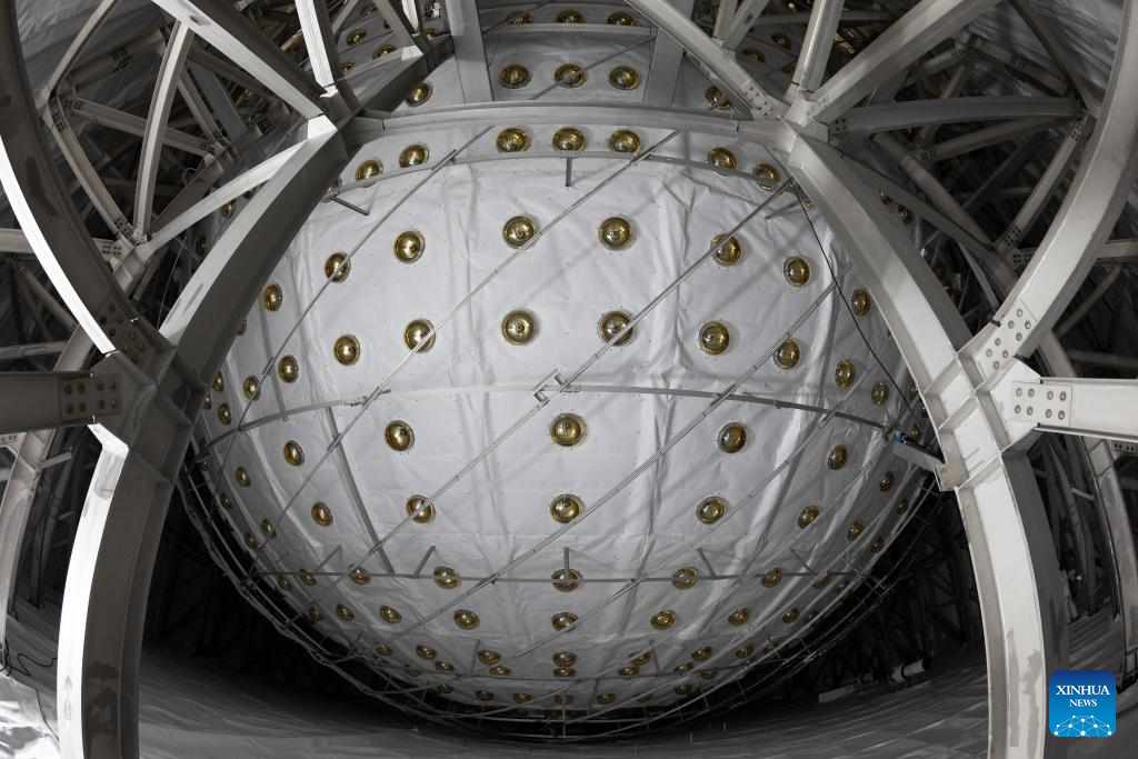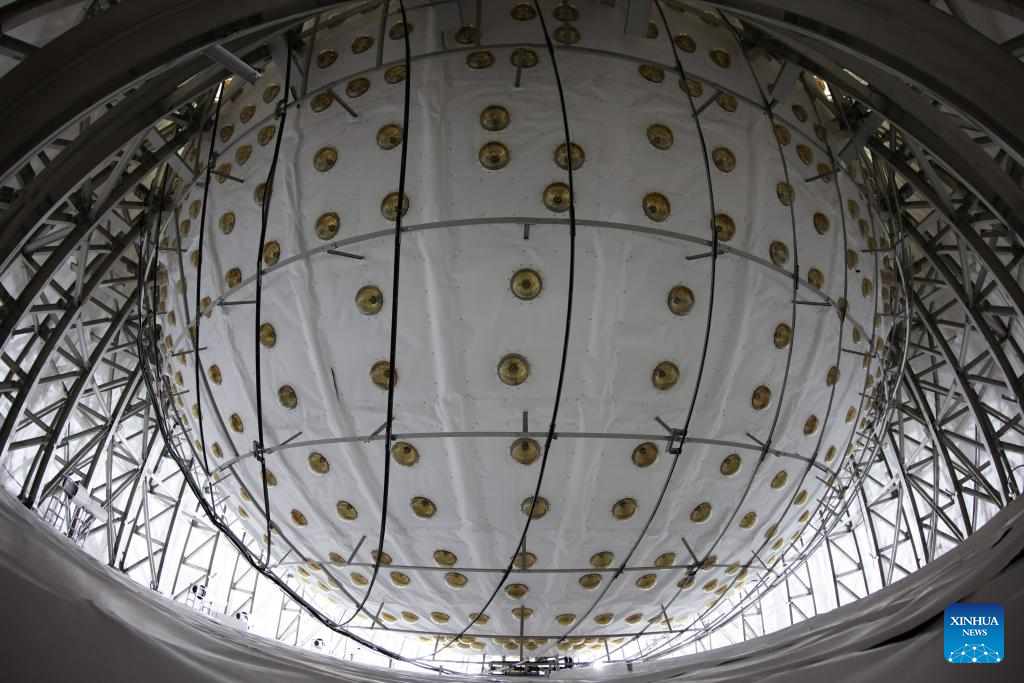 This photo taken on Dec. 17, 2024 shows the central detector of the Jiangmen Underground Neutrino Observatory (JUNO) in Jiangmen, south China's Guangdong Province. The liquid filling of the central detector of JUNO started on Wednesday. As one of the world's most powerful experiments to uncover neutrino mystery, JUNO is expected to operate for at least 30 years. (Xinhua/Jin Liwang)