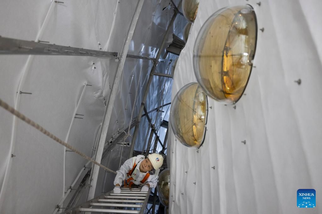A researcher adjusts displacement sensors at the top of the central detector of the Jiangmen Underground Neutrino Observatory (JUNO) in Jiangmen, south China's Guangdong Province, Dec. 17, 2024. The liquid filling of the central detector of JUNO started on Wednesday. As one of the world's most powerful experiments to uncover neutrino mystery, JUNO is expected to operate for at least 30 years. (Xinhua/Jin Liwang)