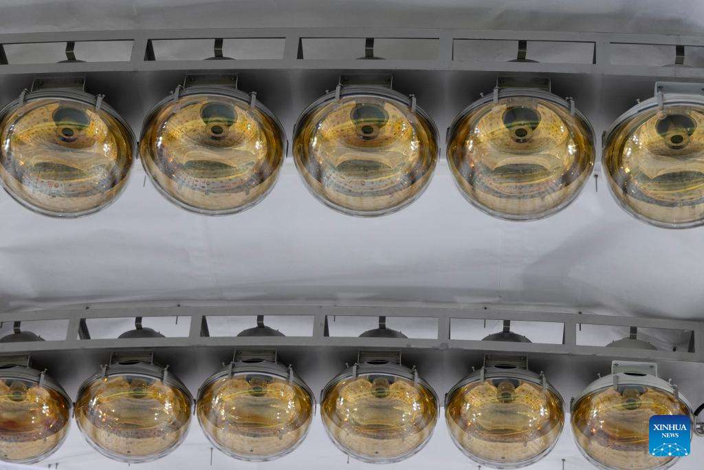 This photo taken on Dec. 17, 2024 shows photo-multiplier tubes seen from the top of the acrylic sphere of the Jiangmen Underground Neutrino Observatory (JUNO) in Jiangmen, south China's Guangdong Province. The liquid filling of the central detector of JUNO started on Wednesday. As one of the world's most powerful experiments to uncover neutrino mystery, JUNO is expected to operate for at least 30 years. (Xinhua/Jin Liwang)