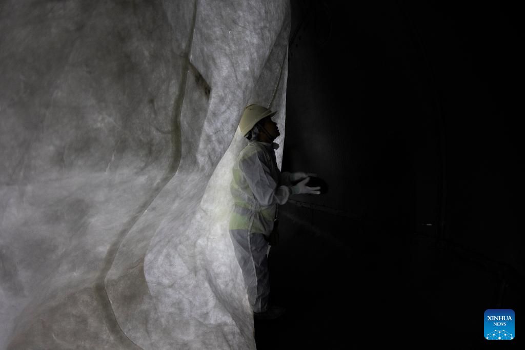 Ma Xiaoyan, chief engineer of the Jiangmen Underground Neutrino Observatory (JUNO), checks the bottom of a water tank of the JUNO in Jiangmen, south China's Guangdong Province, Dec. 16, 2024. The liquid filling of the central detector of JUNO started on Wednesday. As one of the world's most powerful experiments to uncover neutrino mystery, JUNO is expected to operate for at least 30 years. (Xinhua/Jin Liwang)