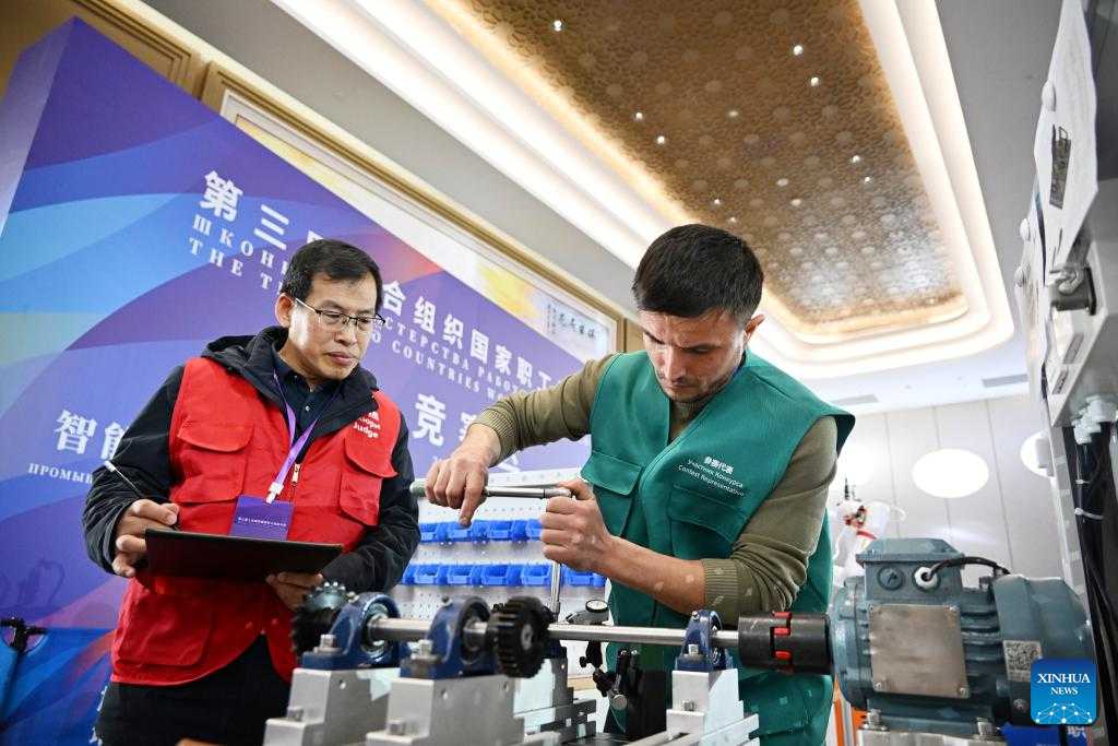 Rustam Sharipov (R) from Uzbekistan competes in the third SCO Countries Worker Skills Contest in Qingdao, east China's Shandong Province, Dec. 18, 2024. The contest kicked off on Wednesday in Qingdao, attracting skilled workers competing in three programs. (Xinhua/Li Ziheng)