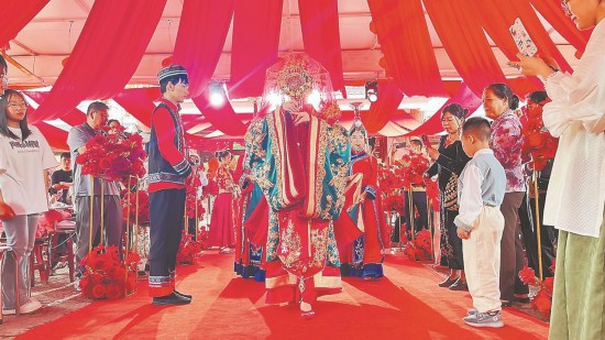 Photo shows a traditional wedding ceremony performance in the Yongding Tulou scenic area in Yongding district, Longyan city, southeast China's Fujian Province. (Photo courtesy of the media convergence center of Yongding district)