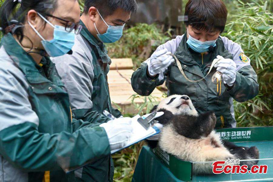 Zoo keepers measure the length of giant panda "Mei Zhu" at the Guangzhou Chimelong Safari Park in Guangzhou, south China's Guangdong Province, Dec. 18, 2024. (China News Service/Chen Jimin)