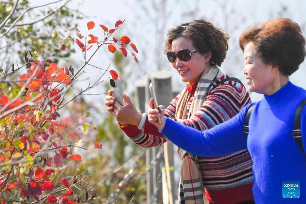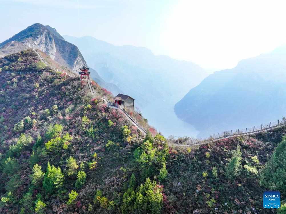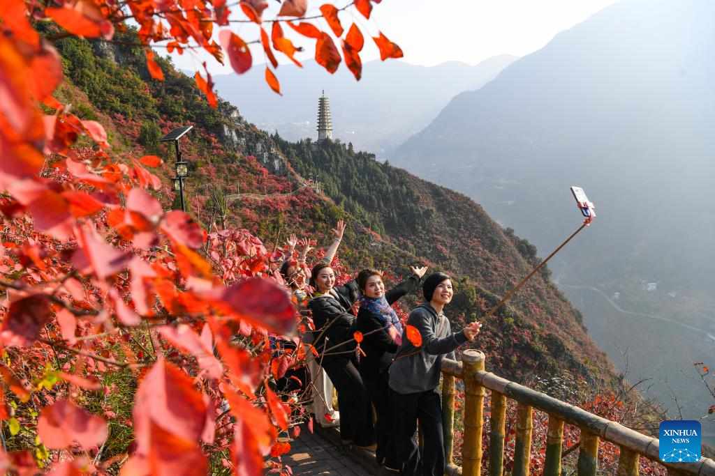 Tourists take photos of red leaves at a scenic spot overlooking Wuxia Gorge, one of the Three Gorges on the Yangtze River, in Wushan County, southwest China's Chongqing, Dec. 18, 2024.