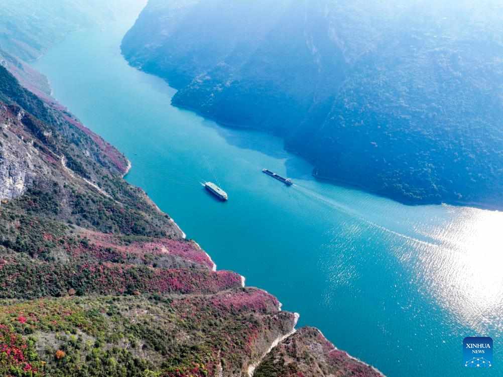 An aerial drone photo shows ships sailing in Wuxia Gorge, one of the Three Gorges on the Yangtze River, in Wushan County, southwest China's Chongqing, Dec. 18, 2024.