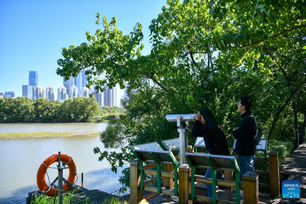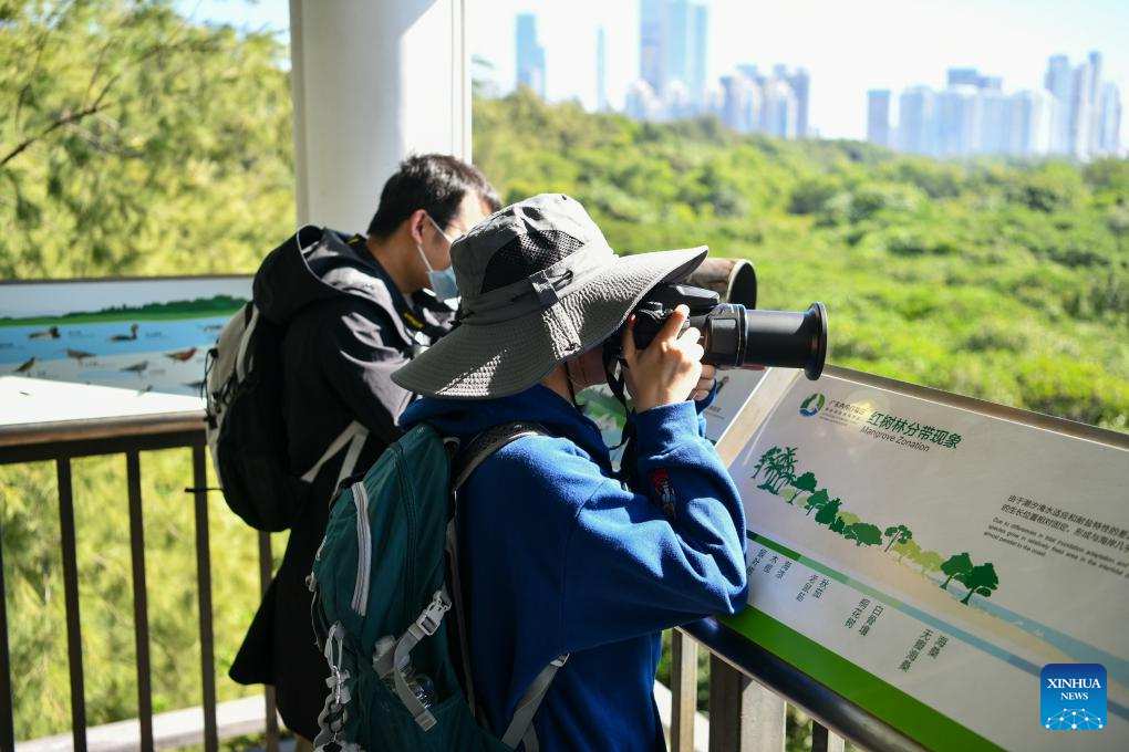 Tourists observe migrant birds at Futian mangrove wetland in Shenzhen City, south China's Guangdong Province, Nov. 29, 2024. The Guangdong-Hong Kong-Macao Greater Bay Area boasts a large expanse of mangroves, especially in Shenzhen, Zhuhai, Jiangmen and Huizhou. Growing in the intertidal zones of tropical and subtropical coasts, mangroves play an important role in purifying seawater, preventing wind and waves, sequestering and storing carbon, and maintaining biodiversity. (Xinhua/Liang Xu)