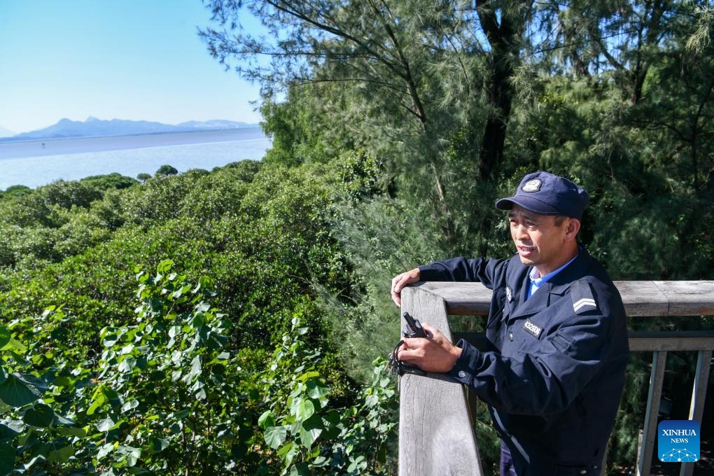A forest ranger patrols at Futian mangrove wetland in Shenzhen City, south China's Guangdong Province, Nov. 29, 2024. The Guangdong-Hong Kong-Macao Greater Bay Area boasts a large expanse of mangroves, especially in Shenzhen, Zhuhai, Jiangmen and Huizhou. Growing in the intertidal zones of tropical and subtropical coasts, mangroves play an important role in purifying seawater, preventing wind and waves, sequestering and storing carbon, and maintaining biodiversity. (Xinhua/Liang Xu)