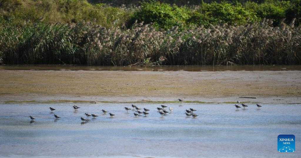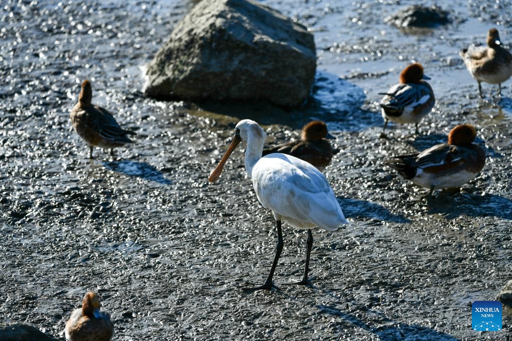 Migrant birds forage at a mangrove coastal eco-park in Shenzhen City, south China's Guangdong Province, Nov. 29, 2024. The Guangdong-Hong Kong-Macao Greater Bay Area boasts a large expanse of mangroves, especially in Shenzhen, Zhuhai, Jiangmen and Huizhou. Growing in the intertidal zones of tropical and subtropical coasts, mangroves play an important role in purifying seawater, preventing wind and waves, sequestering and storing carbon, and maintaining biodiversity. (Xinhua/Liang Xu)