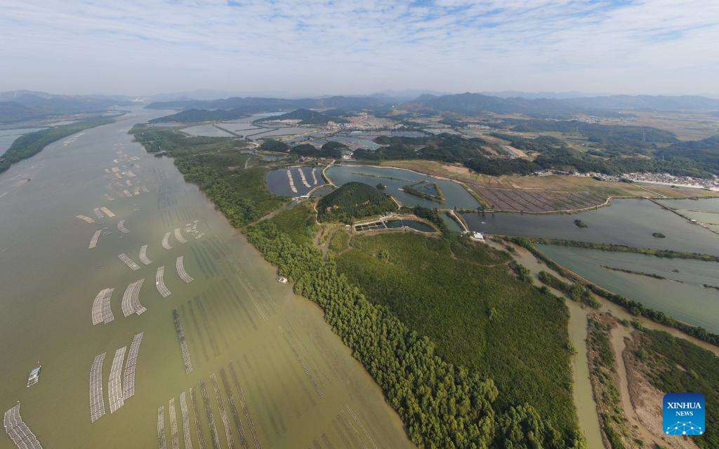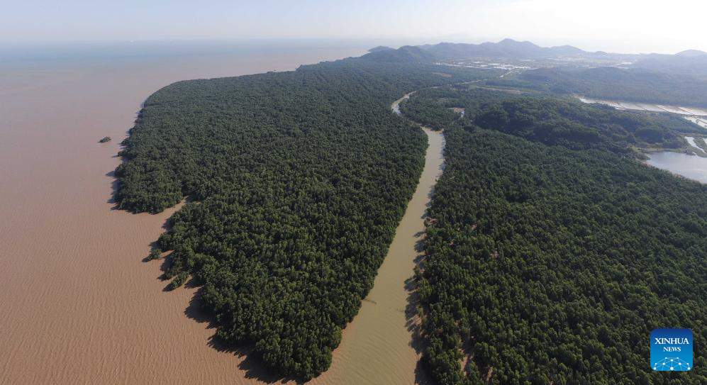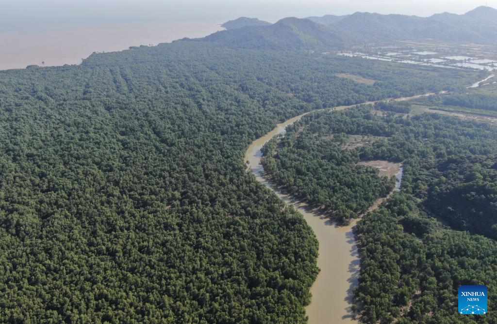 An aerial drone photo shows mangrove forests on Qi'ao Island of Zhuhai City, south China's Guangdong Province, Nov. 27, 2024. The Guangdong-Hong Kong-Macao Greater Bay Area boasts a large expanse of mangroves, especially in Shenzhen, Zhuhai, Jiangmen and Huizhou. Growing in the intertidal zones of tropical and subtropical coasts, mangroves play an important role in purifying seawater, preventing wind and waves, sequestering and storing carbon, and maintaining biodiversity. (Xinhua/Deng Hua)
