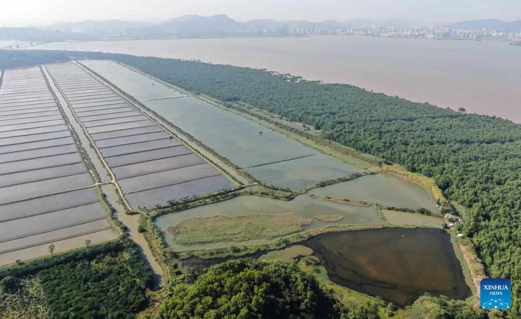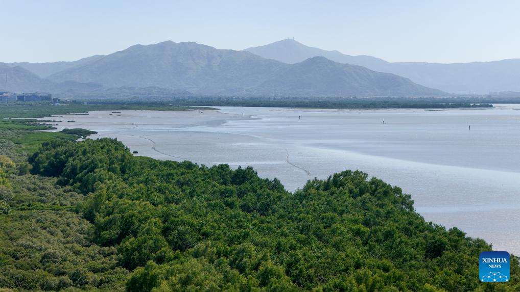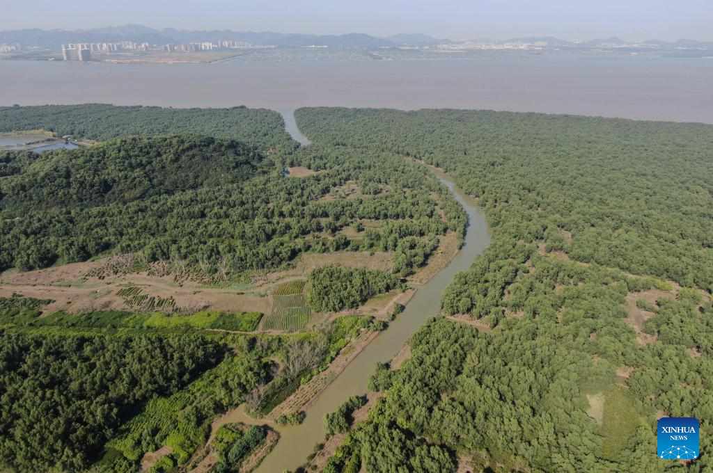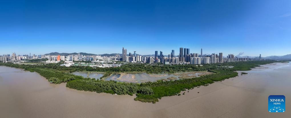 An aerial drone photo shows a panoramic view of Futian mangrove wetland in Shenzhen City, south China's Guangdong Province, Nov. 29, 2024. The Guangdong-Hong Kong-Macao Greater Bay Area boasts a large expanse of mangroves, especially in Shenzhen, Zhuhai, Jiangmen and Huizhou. Growing in the intertidal zones of tropical and subtropical coasts, mangroves play an important role in purifying seawater, preventing wind and waves, sequestering and storing carbon, and maintaining biodiversity. (Xinhua/Liang Xu)