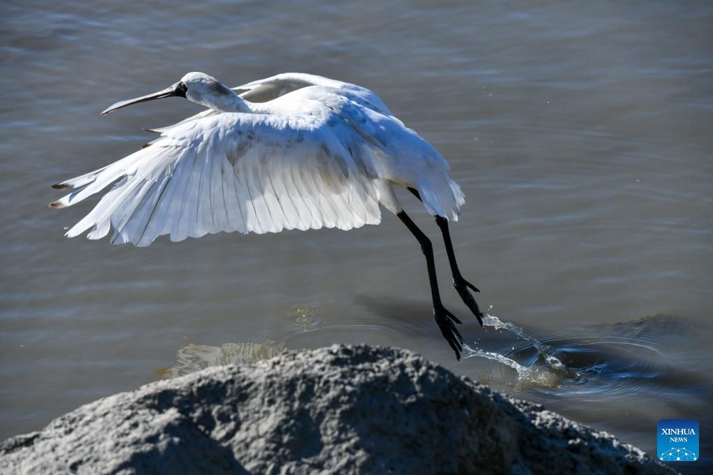 A black-faced spoonbill flies at a mangrove coastal eco-park in Shenzhen City, south China's Guangdong Province, Nov. 29, 2024. The Guangdong-Hong Kong-Macao Greater Bay Area boasts a large expanse of mangroves, especially in Shenzhen, Zhuhai, Jiangmen and Huizhou. Growing in the intertidal zones of tropical and subtropical coasts, mangroves play an important role in purifying seawater, preventing wind and waves, sequestering and storing carbon, and maintaining biodiversity. (Xinhua/Liang Xu)