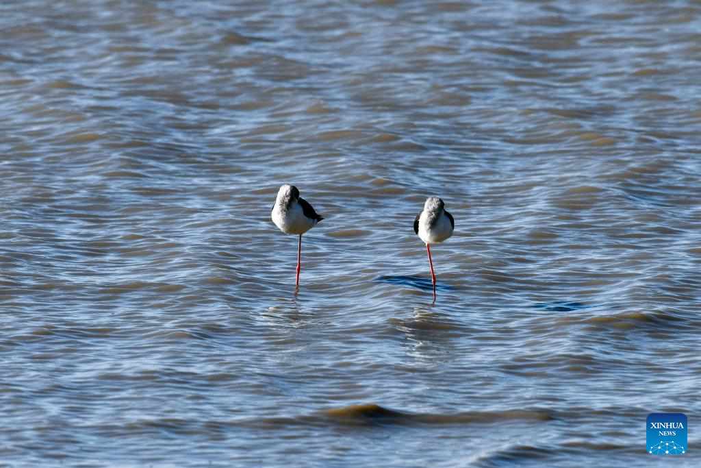 Black-winged stilts are pictured at a mangrove coastal eco-park in Shenzhen City, south China's Guangdong Province, Nov. 29, 2024. The Guangdong-Hong Kong-Macao Greater Bay Area boasts a large expanse of mangroves, especially in Shenzhen, Zhuhai, Jiangmen and Huizhou. Growing in the intertidal zones of tropical and subtropical coasts, mangroves play an important role in purifying seawater, preventing wind and waves, sequestering and storing carbon, and maintaining biodiversity. (Xinhua/Liang Xu)