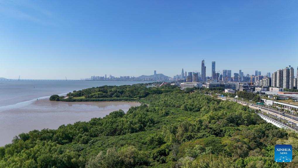 An aerial drone photo taken on Nov. 29, 2024 shows Futian mangrove wetland in Shenzhen City of Guangdong Province and Mai Po mangrove wetland in Hong Kong, south China. The Guangdong-Hong Kong-Macao Greater Bay Area boasts a large expanse of mangroves, especially in Shenzhen, Zhuhai, Jiangmen and Huizhou. Growing in the intertidal zones of tropical and subtropical coasts, mangroves play an important role in purifying seawater, preventing wind and waves, sequestering and storing carbon, and maintaining biodiversity. (Xinhua/Liang Xu)