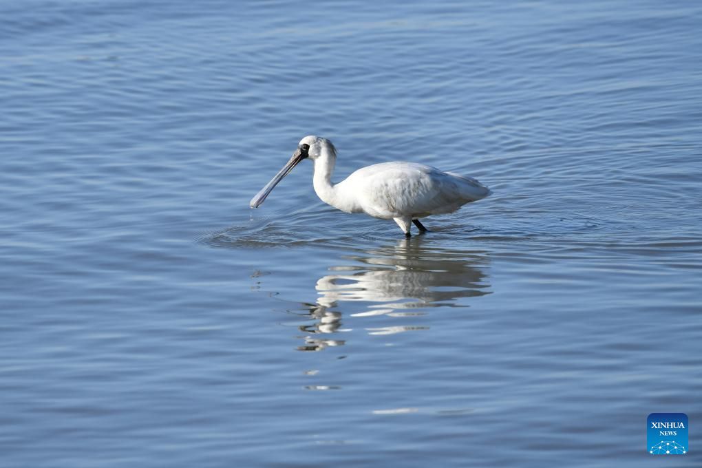 A black-faced spoonbill forages at a mangrove coastal eco-park in Shenzhen City, south China's Guangdong Province, Nov. 29, 2024. The Guangdong-Hong Kong-Macao Greater Bay Area boasts a large expanse of mangroves, especially in Shenzhen, Zhuhai, Jiangmen and Huizhou. Growing in the intertidal zones of tropical and subtropical coasts, mangroves play an important role in purifying seawater, preventing wind and waves, sequestering and storing carbon, and maintaining biodiversity. (Xinhua/Liang Xu)