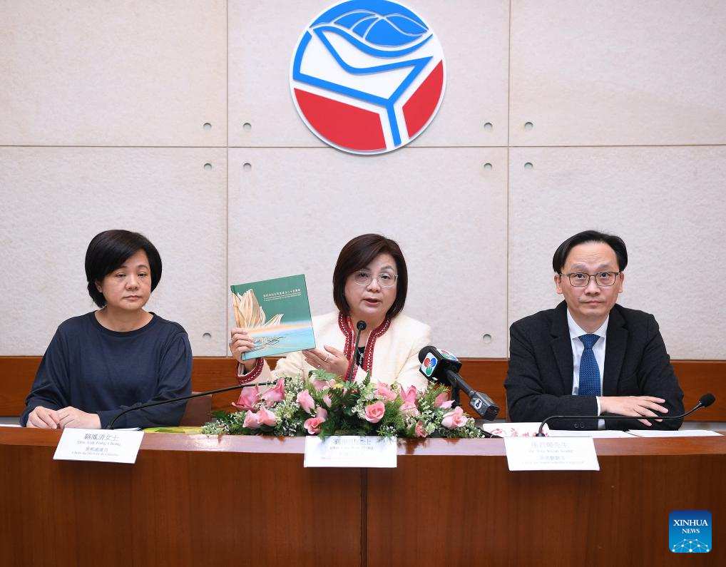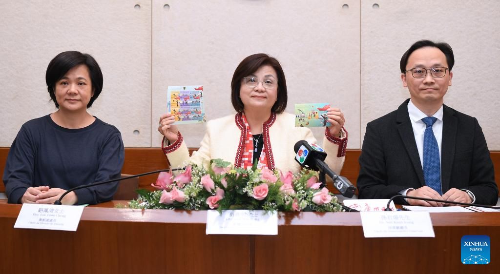 Lau Wai Meng (C), director of Macao Post and Telecommunications Bureau, displays new philatelic products during a press conference in south China's Macao, Dec. 19, 2024. The Macao Post and Telecommunications Bureau will issue philatelic products on Dec. 20 to mark the 25th anniversary of the establishment of the Macao Special Administrative Region and the 25th anniversary of the Chinese People's Liberation Army Garrison stationed in Macao. (Xinhua/Chen Duo)