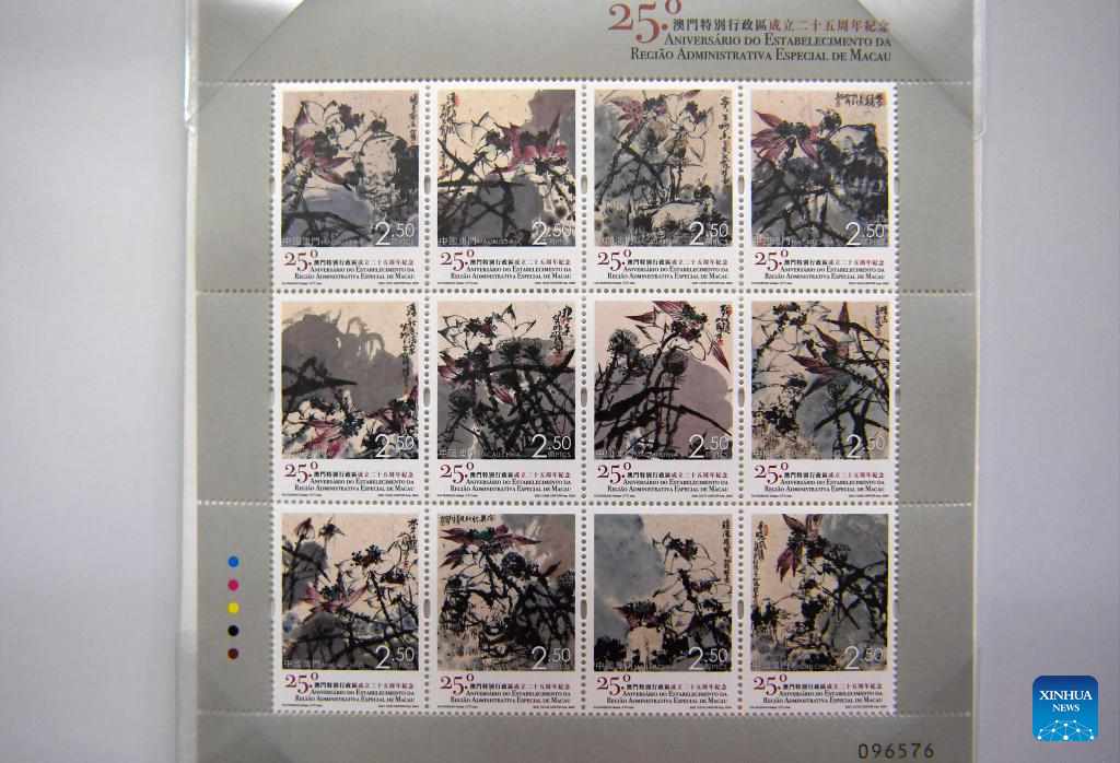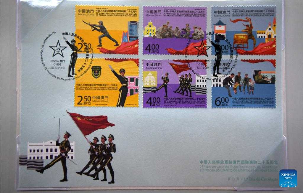 This photo taken on Dec. 19, 2024 shows the stamps to mark the 25th anniversary of the establishment of the Macao Special Administrative Region. The Macao Post and Telecommunications Bureau will issue philatelic products on Dec. 20 to mark the 25th anniversary of the establishment of the Macao Special Administrative Region and the 25th anniversary of the Chinese People's Liberation Army Garrison stationed in Macao. (Xinhua/Chen Duo)