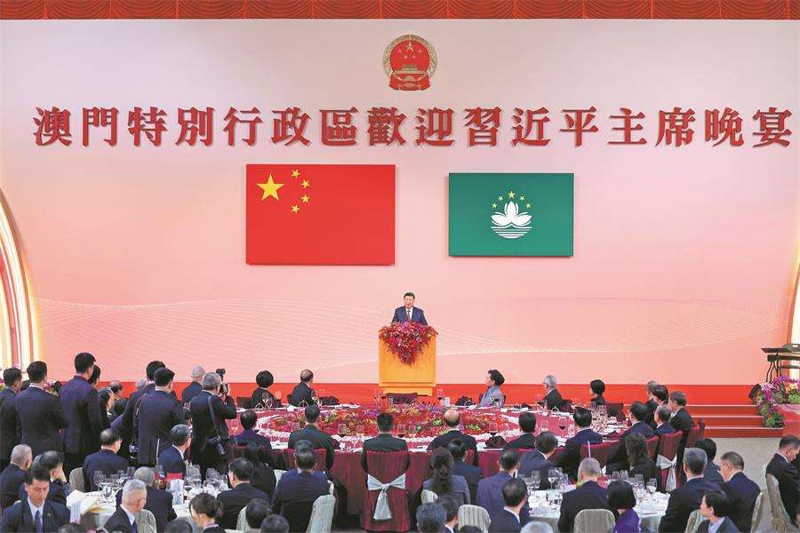 President Xi Jinping delivers a speech at a welcoming banquet at the Macao East Asian Games Dome on Thursday evening, the eve of the 25th anniversary of Macao's return to the motherland. (Feng Yongbin/China Daily)