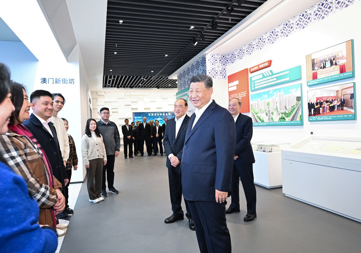 At Hengqin's scenic Tianmu Qintai public facility, Xi, who is also general secretary of the Communist Party of China Central Committee and chairman of the Central Military Commission, toured an exhibition on the progress made in regional integration and in-depth cooperation.