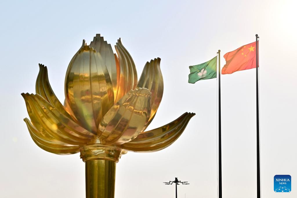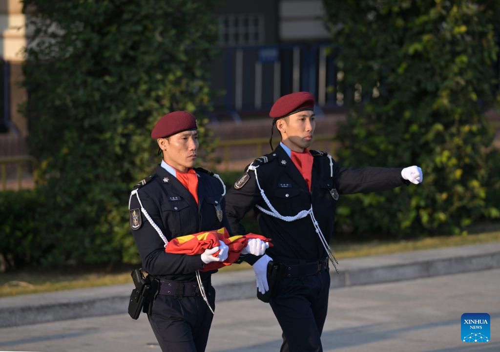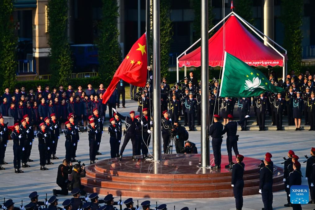 A flag-raising ceremony marking the 25th anniversary of Macao's return to the motherland is held at the Golden Lotus Square in Macao, south China, Dec. 20, 2024. (Xinhua/Zhu Wei)