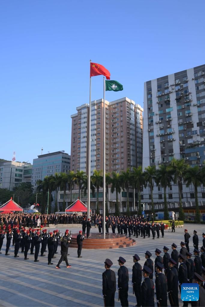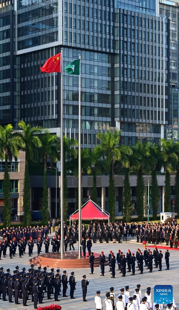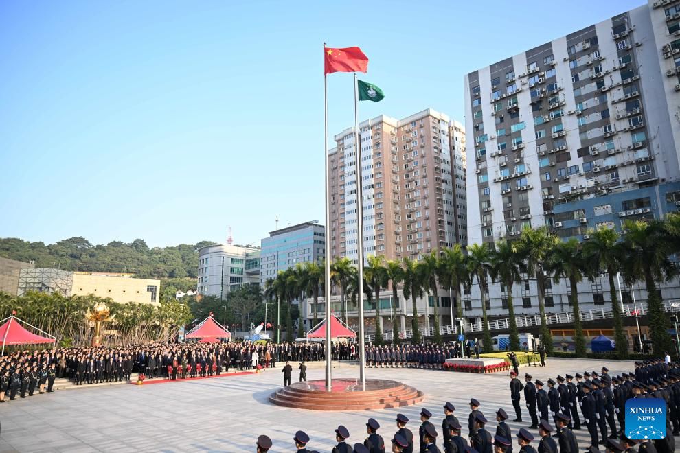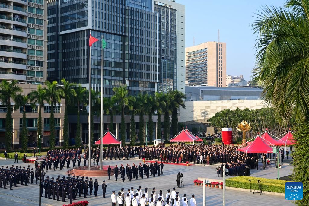 A flag-raising ceremony marking the 25th anniversary of Macao's return to the motherland is held at the Golden Lotus Square in Macao, south China, Dec. 20, 2024. (Xinhua/Cheong Kam Ka)