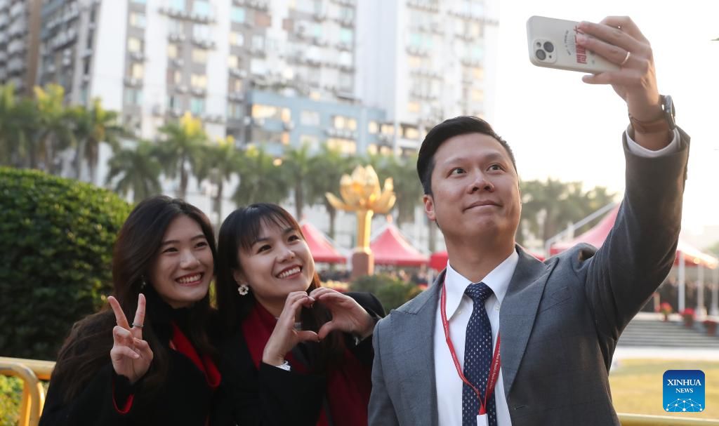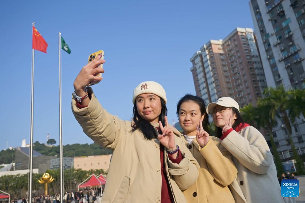 People take selfies before a flag-raising ceremony marking the 25th anniversary of Macao's return to the motherland at the Golden Lotus Square in Macao, south China, Dec. 20, 2024. (Xinhua/Yao Qilin)