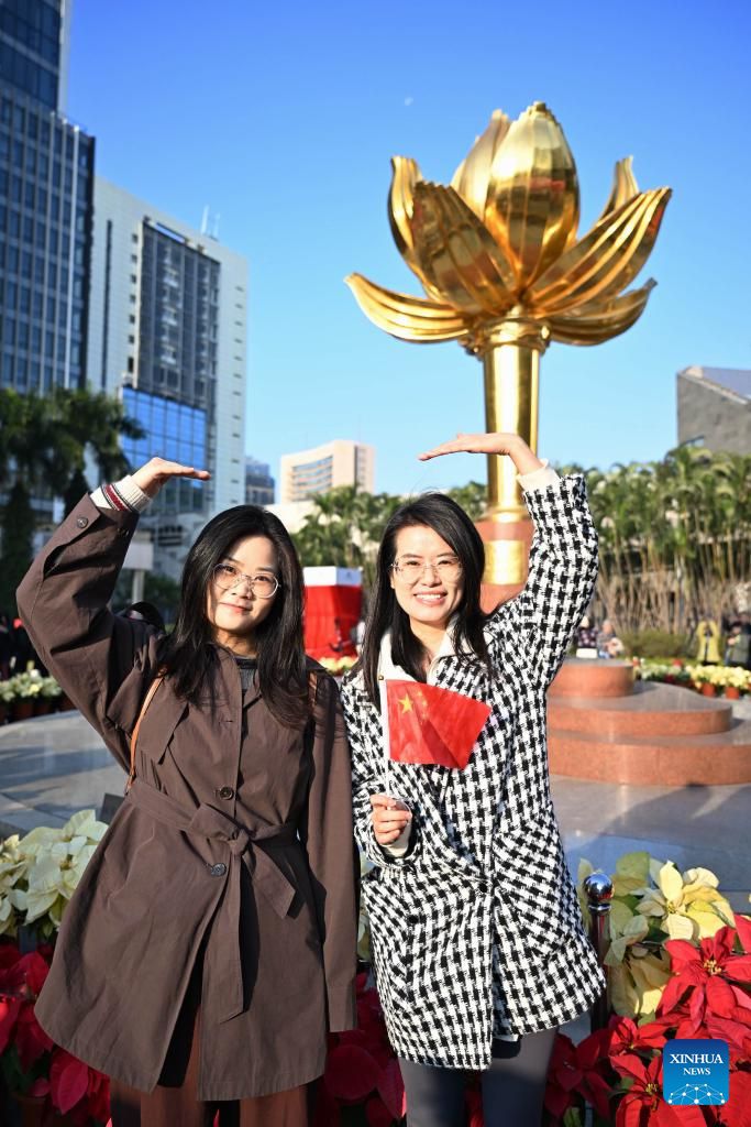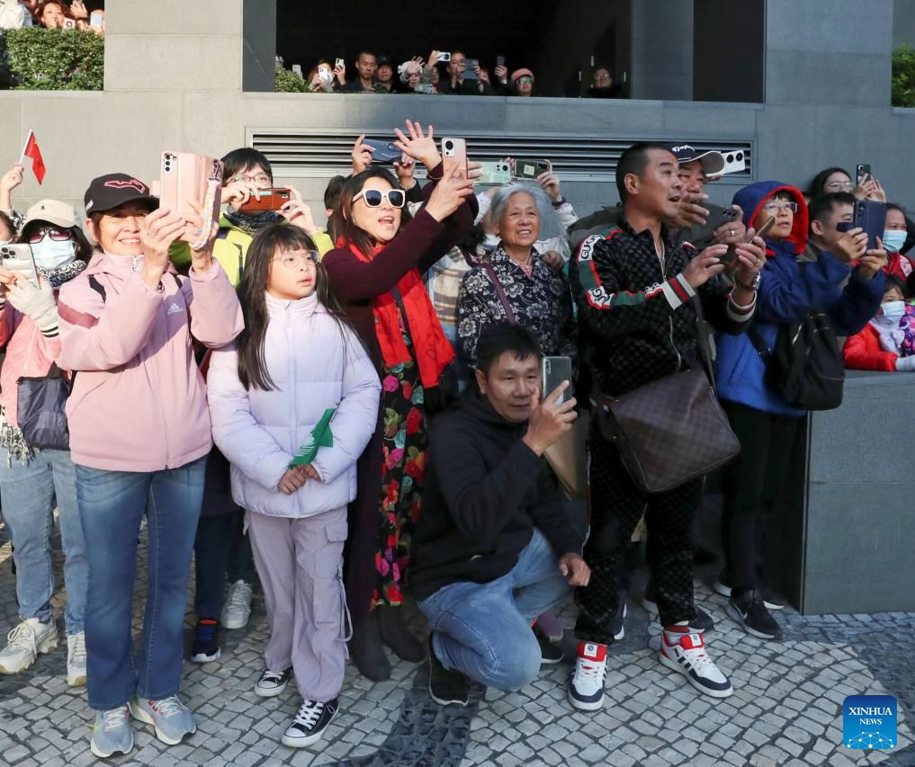 People pose for photos after a flag-raising ceremony marking the 25th anniversary of Macao's return to the motherland at the Golden Lotus Square in Macao, south China, Dec. 20, 2024. (Xinhua/Cheng Yiheng)