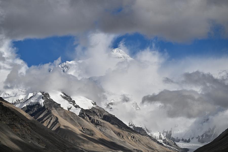 This photo taken on Sept. 4, 2024 from the Mount Qomolangma base camp in Tingri County of Xigaze City in southwest China's Xizang Autonomous Region shows a view of Mount Qomolangma. (Xinhua/Sun Ruibo)