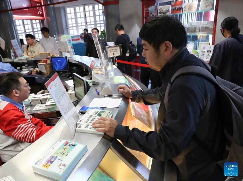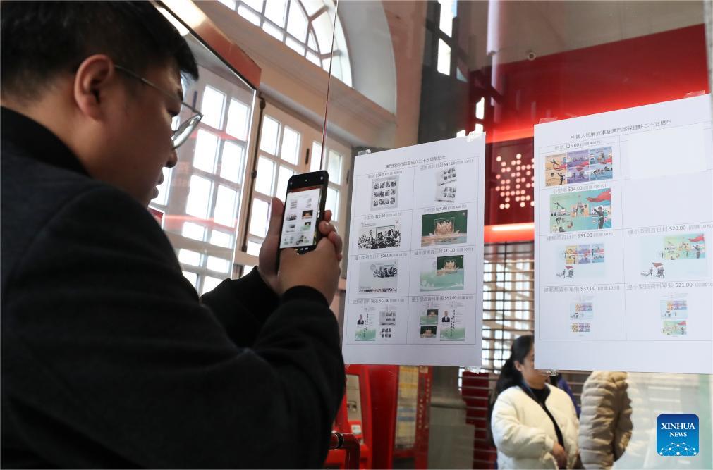 People buy the new philatelic products at a philatelic shop in south China's Macao, Dec. 20, 2024. The Macao Post and Telecommunications Bureau issued philatelic products on Dec. 20 to mark the 25th anniversary of the establishment of the Macao Special Administrative Region and the 25th anniversary of the Chinese People's Liberation Army garrison stationed in Macao. (Xinhua/Yao Qilin)