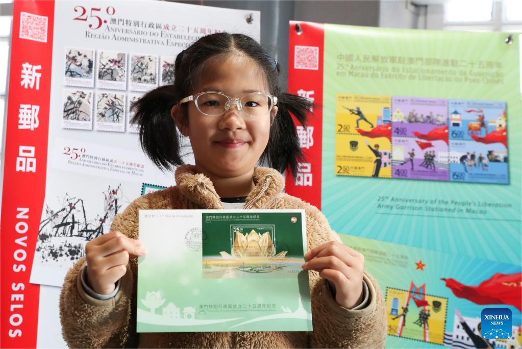 A child displays the first-day cover of a set of commemorative philatelic products at a philatelic shop in south China's Macao, Dec. 20, 2024. The Macao Post and Telecommunications Bureau issued philatelic products on Dec. 20 to mark the 25th anniversary of the establishment of the Macao Special Administrative Region and the 25th anniversary of the Chinese People's Liberation Army garrison stationed in Macao. (Xinhua/Yao Qilin)
