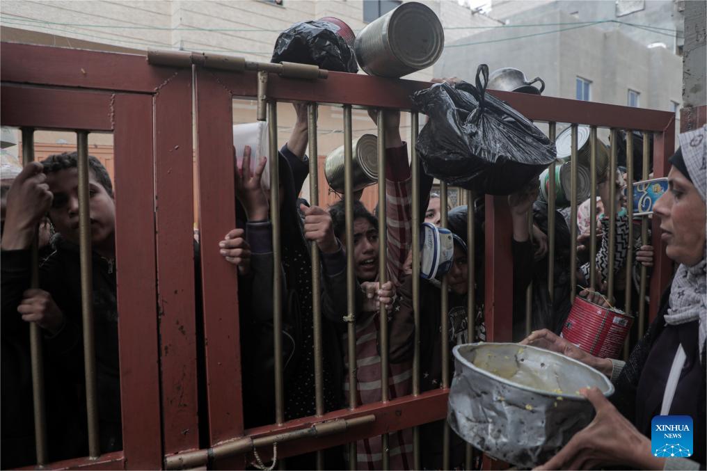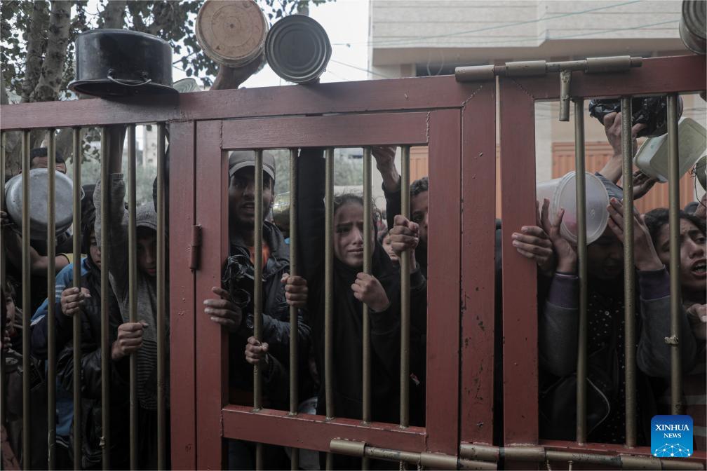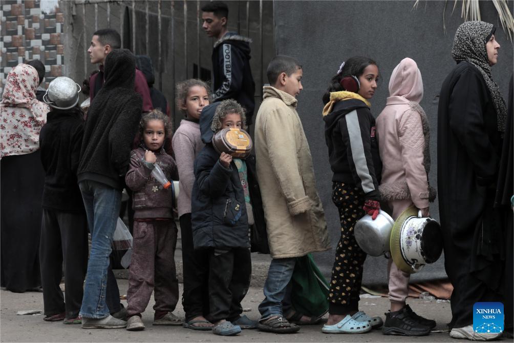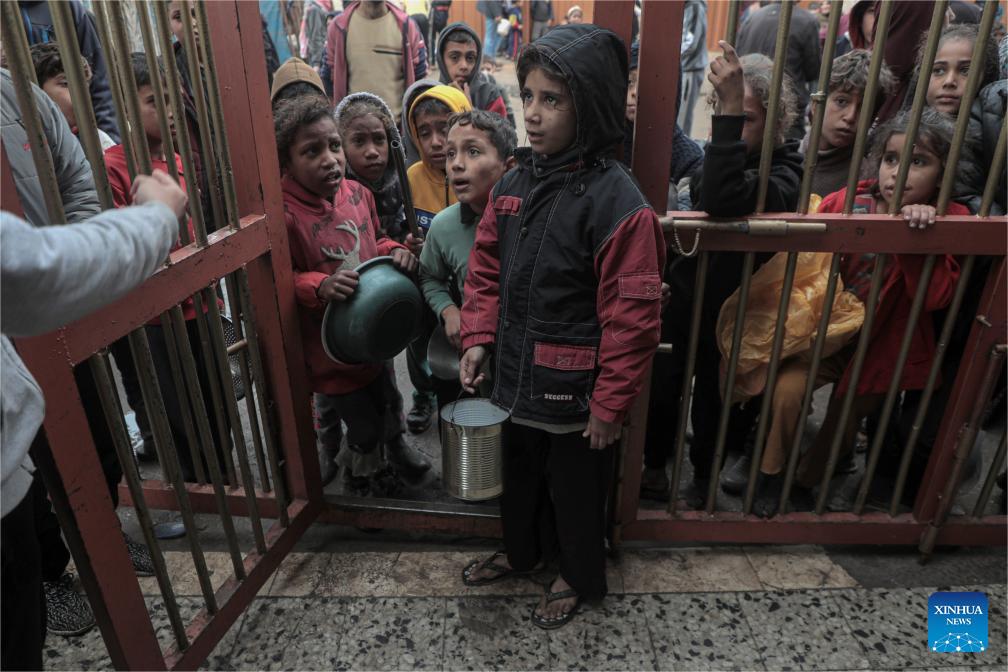 Children wait to receive food relief at a food distribution center in the city of Deir al-Balah, central Gaza Strip, on Dec. 20, 2024. Across the besieged coastal enclave, hunger is spreading amid severe flour shortages and reduced food distribution centers due to access constraints and insecurity. (Photo by Rizek Abdeljawad/Xinhua)