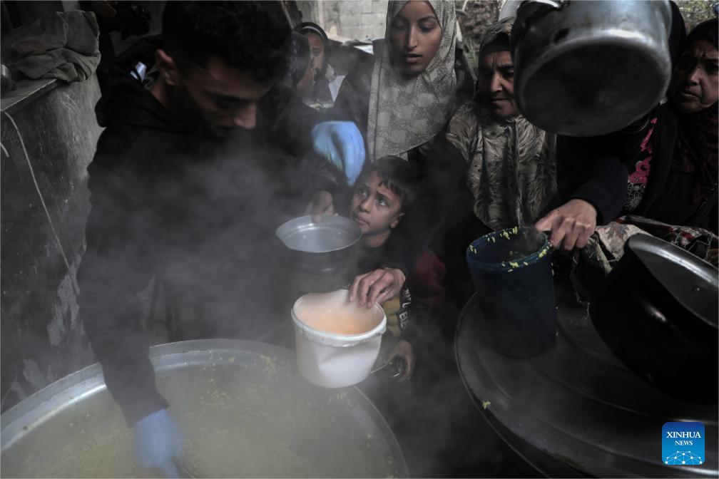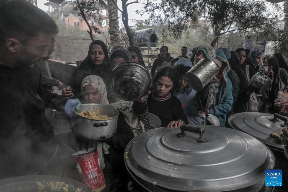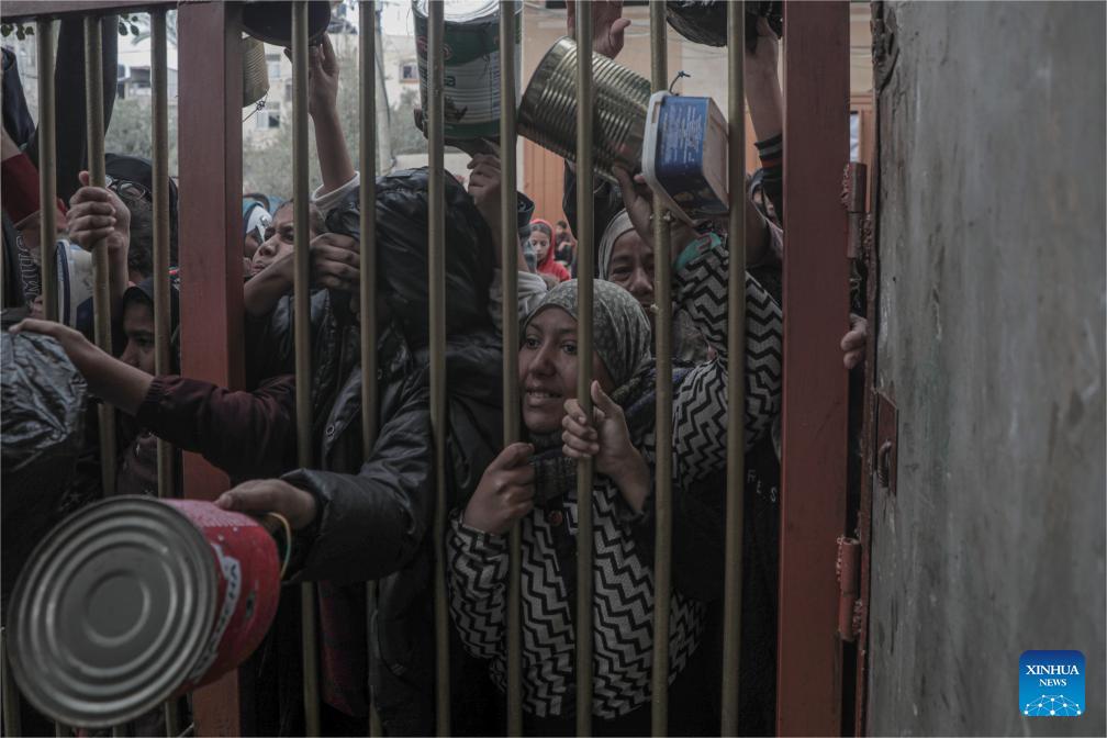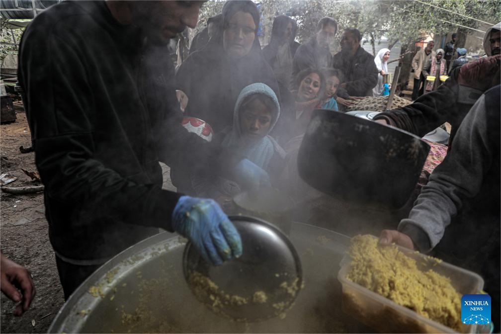 People receive food relief at a food distribution center in the city of Deir al-Balah, central Gaza Strip, on Dec. 20, 2024. Across the besieged coastal enclave, hunger is spreading amid severe flour shortages and reduced food distribution centers due to access constraints and insecurity. (Photo by Rizek Abdeljawad/Xinhua)