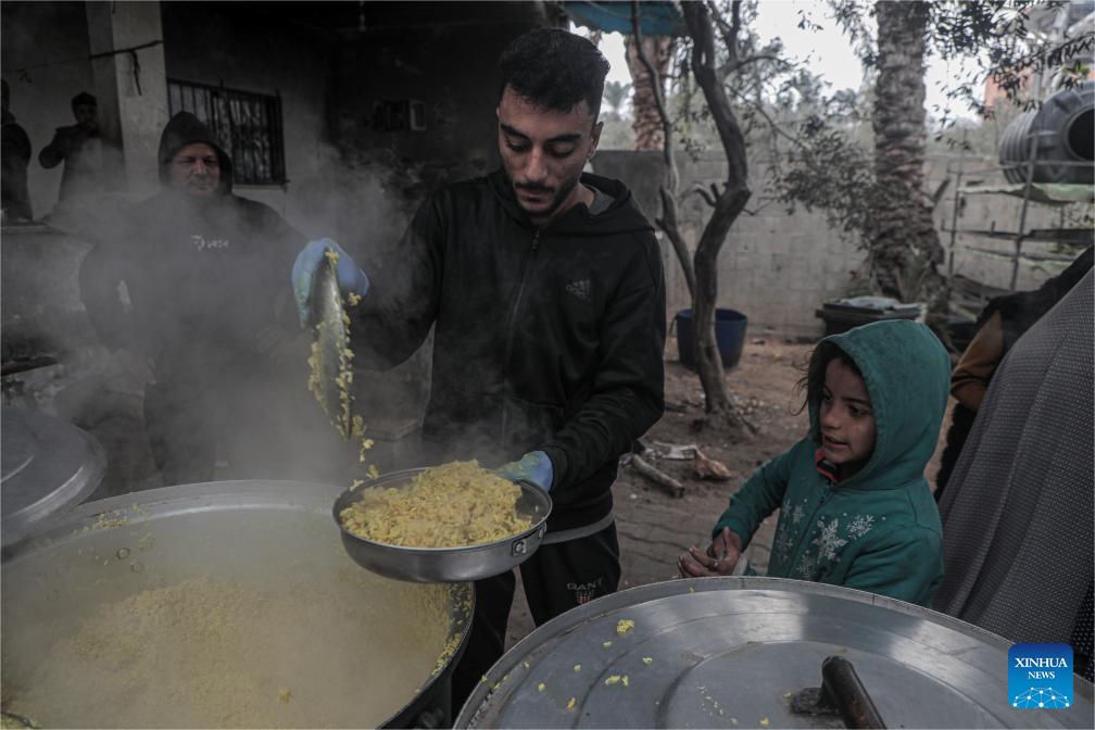 A man prepares food for people at a food distribution center in the city of Deir al-Balah, central Gaza Strip, on Dec. 20, 2024. Across the besieged coastal enclave, hunger is spreading amid severe flour shortages and reduced food distribution centers due to access constraints and insecurity. (Photo by Rizek Abdeljawad/Xinhua)