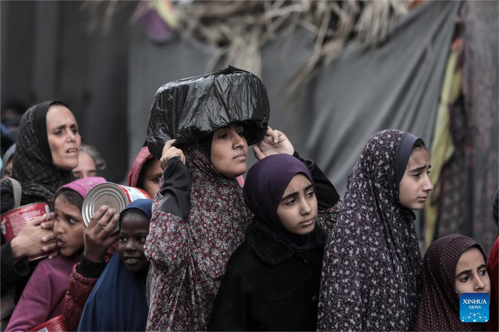 People line up to receive food relief at a food distribution center in the city of Deir al-Balah, central Gaza Strip, on Dec. 20, 2024. Across the besieged coastal enclave, hunger is spreading amid severe flour shortages and reduced food distribution centers due to access constraints and insecurity. (Photo by Rizek Abdeljawad/Xinhua)