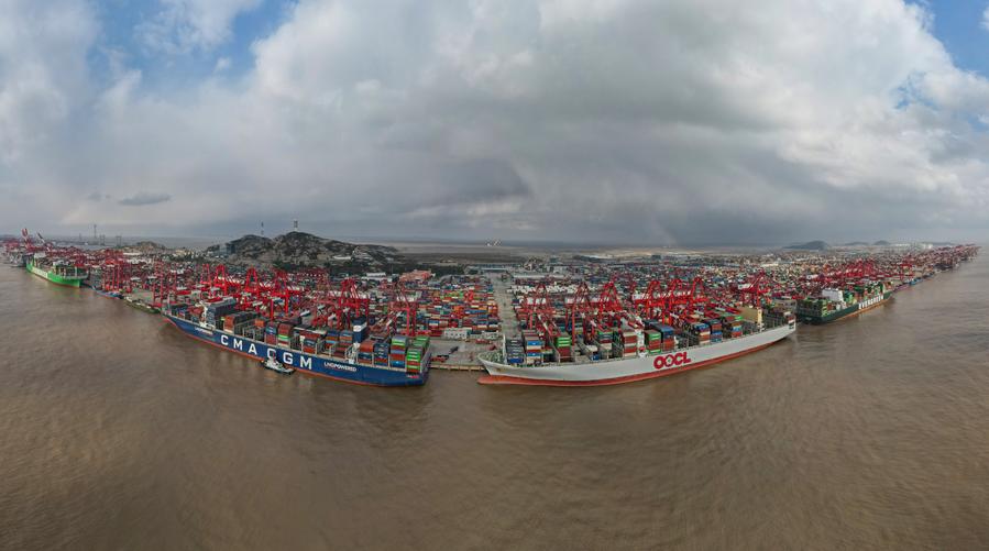 An aerial drone photo shows a panoramic view of Yangshan Port of Shanghai Port, east China, Dec. 18, 2024. (Xinhua/Fang Zhe)