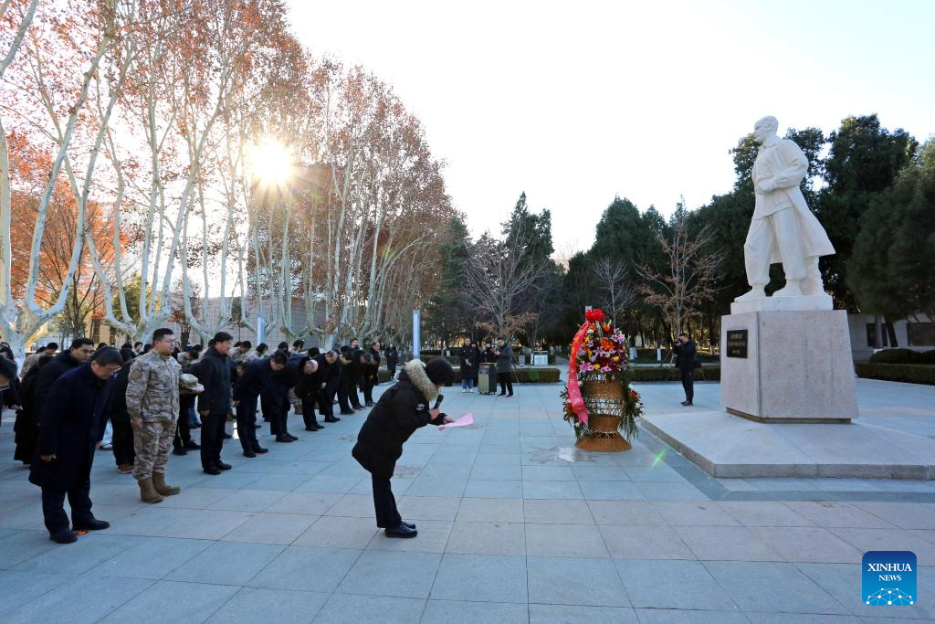 Participants bow before the tomb of Canadian surgeon Norman Bethune during a commemoration event in Shijiazhuang, north China's Hebei Province, Dec. 21, 2024. (The North China Military Martyrs Cemetery/Handout via Xinhua)