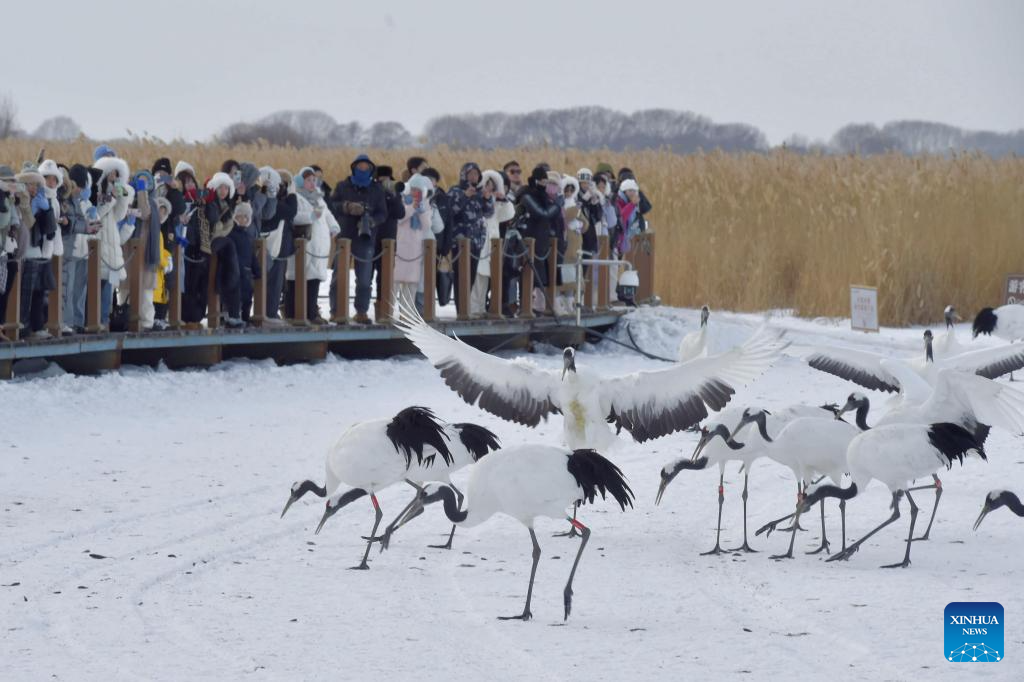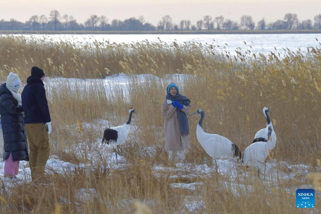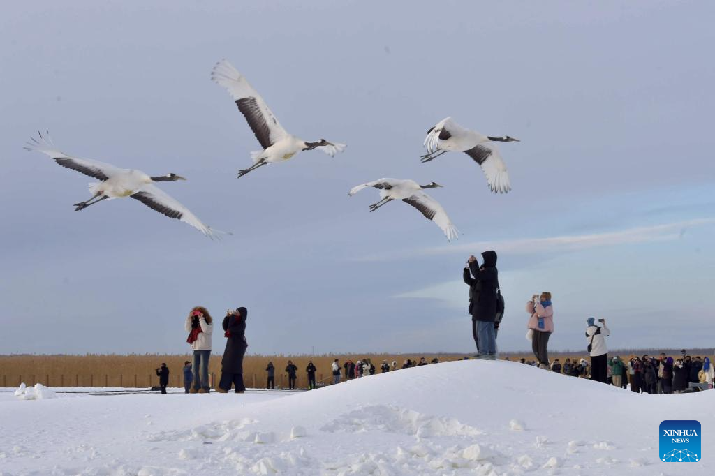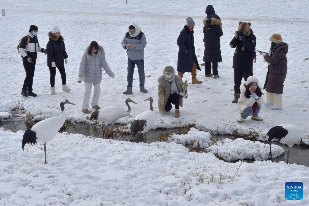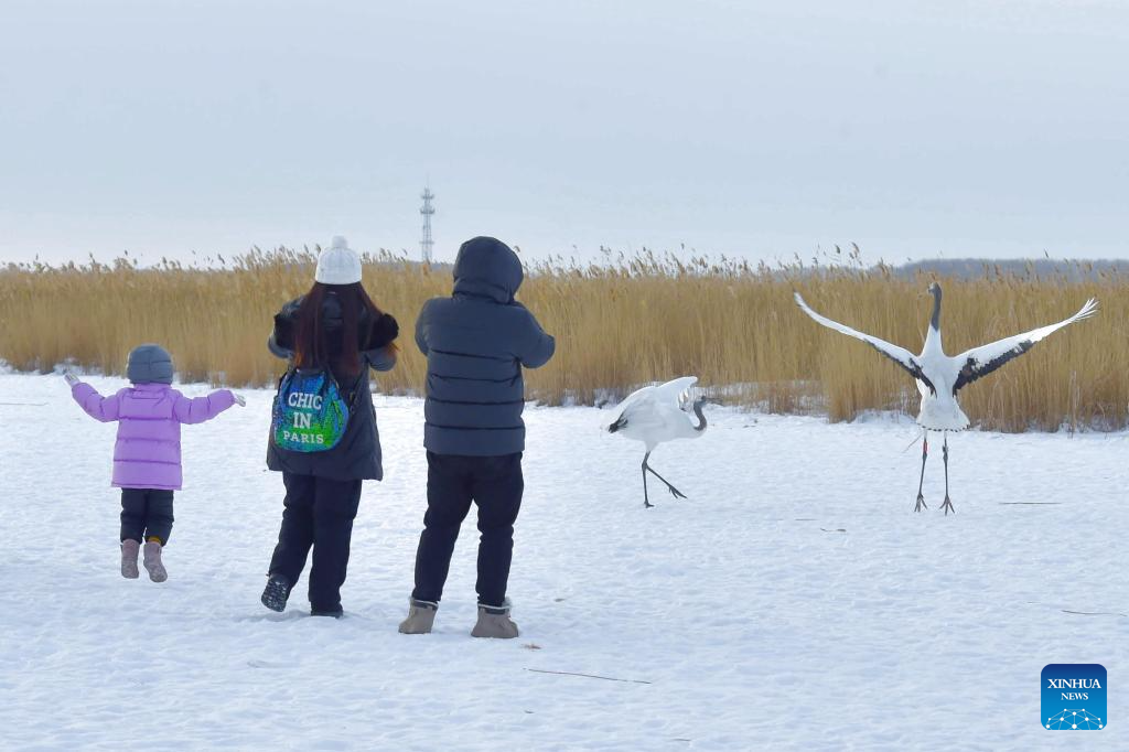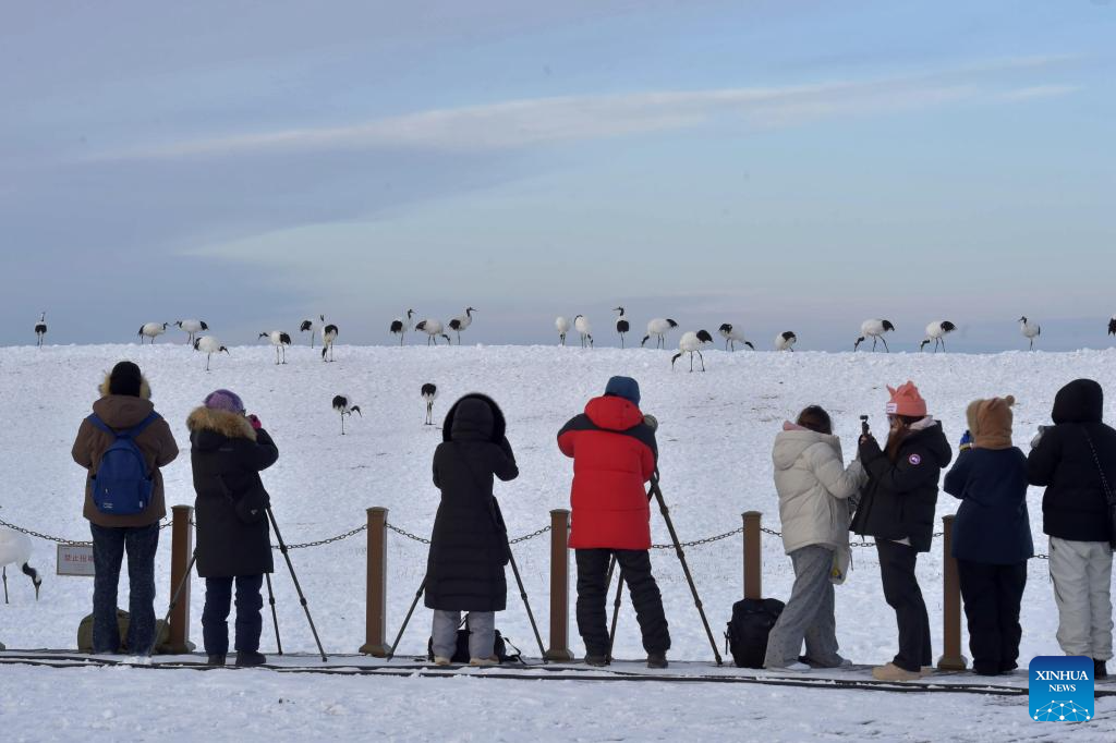 People watch red-crowned cranes at the snow covered Zhalong National Nature Reserve in Qiqihar, northeast China's Heilongjiang Province, Dec. 22, 2024. The artificial-bred red-crowned cranes at Zhalong National Nature Reserve have become a tourist attraction in winter. (Photo by Wang Yonggang/Xinhua)