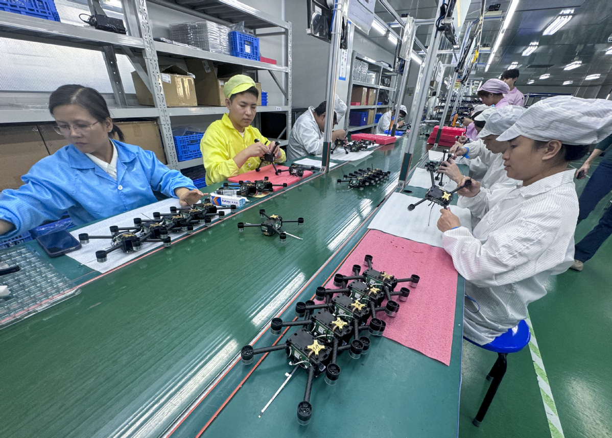 Staff members assemble drones at a production line in Longgang district, Shenzhen, South China's Guangdong province, on Nov 6, 2024. (Photo/Xinhua)