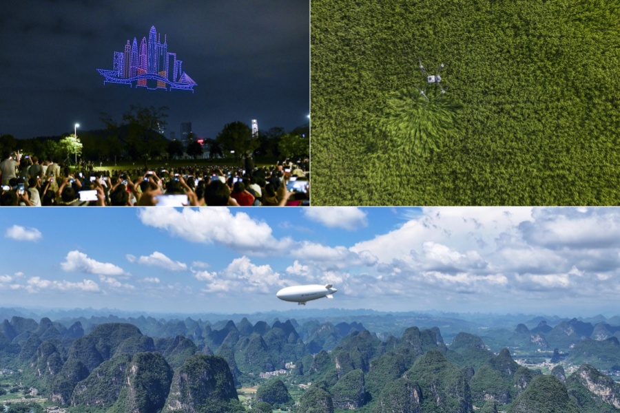 Upper left: Tourists take photos of a drone show in Futian district of Shenzhen, South China's Guangdong province, Oct 4, 2024. Upper right: A DJI agriculture drone sprays a rice field in Guangzhou, South China's Guangdong province, on June 21, 2024. Below: China's first homegrown AS700 civil manned airship during its demonstration flight in Yangshuo county in Guilin, South China's Guangxi Zhuang autonomous region, Sept 14, 2024. (Photo/Xinhua)