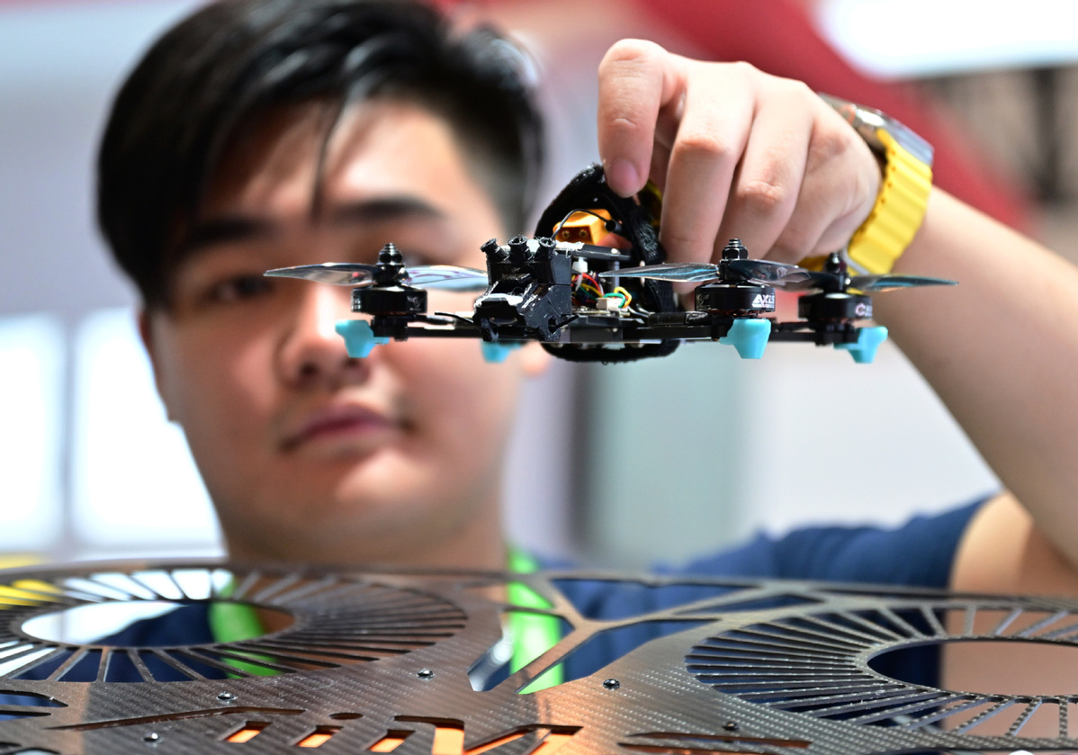 A staff member shows a drone at the First Jinjiang Trade Fair on Scientific and Technological Innovation in Quanzhou, Fujian province, April 9, 2024. (Photo/Xinhua)