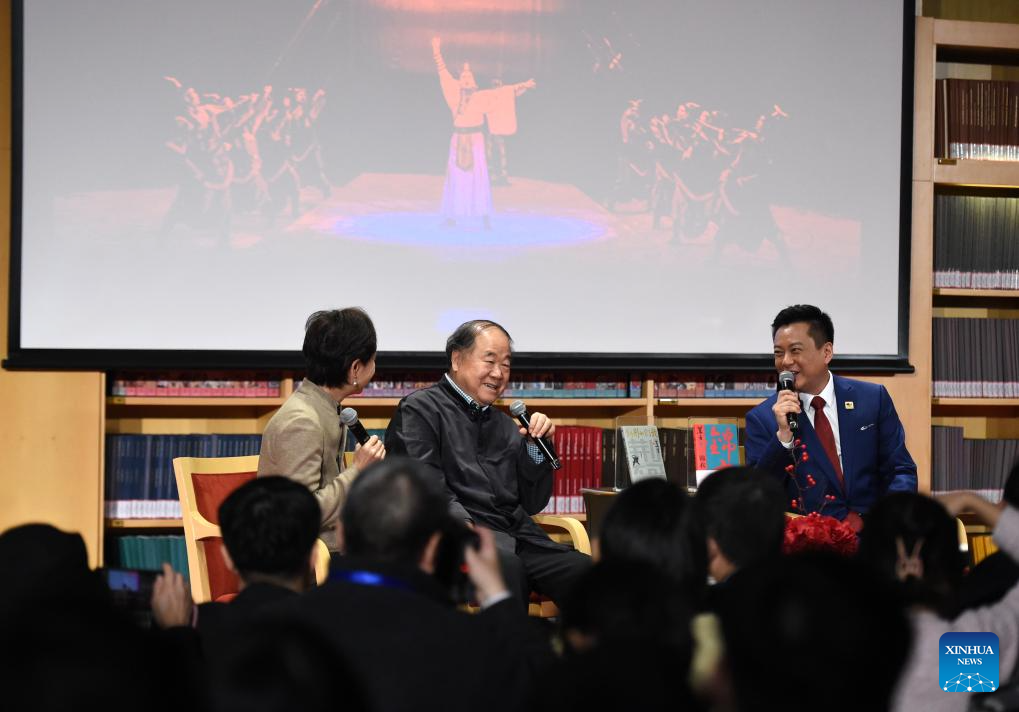 Writer Mo Yan (C) and Wang Ban (R), vice president of the National Centre for the Performing Arts (NCPA), speak during a sharing session of Mo Yan's drama works at NCPA in Beijing, capital of China, Dec. 22, 2024. NCPA staged 15 performances and more than 50 activities on its open day to celebrate its 17th anniversary. (Xinhua/Luo Xiaoguang)