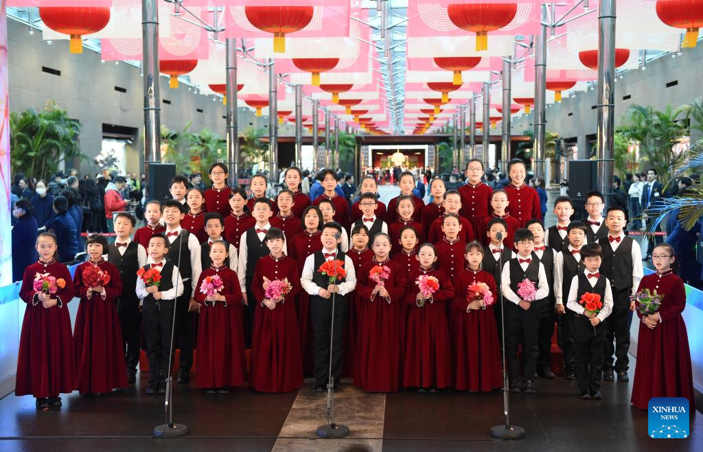 Children perform chorus to welcome guests at the National Centre for the Performing Arts (NCPA) in Beijing, capital of China, Dec. 22, 2024. NCPA staged 15 performances and more than 50 activities on its open day to celebrate its 17th anniversary. (Xinhua/Luo Xiaoguang)