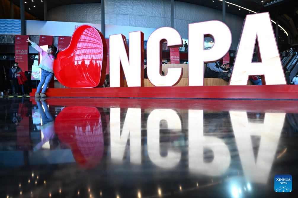 A child poses for photos with an "I love NCPA" sign at the National Centre for the Performing Arts (NCPA) in Beijing, capital of China, Dec. 22, 2024. NCPA staged 15 performances and more than 50 activities on its open day to celebrate its 17th anniversary. (Xinhua/Chen Zhonghao)